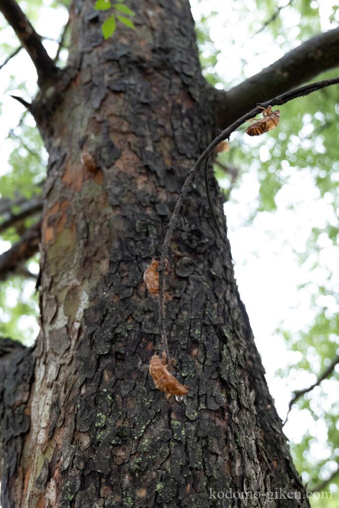 雨を避けてくれていた木を見上げると、蝉の抜け殻がたくさん!