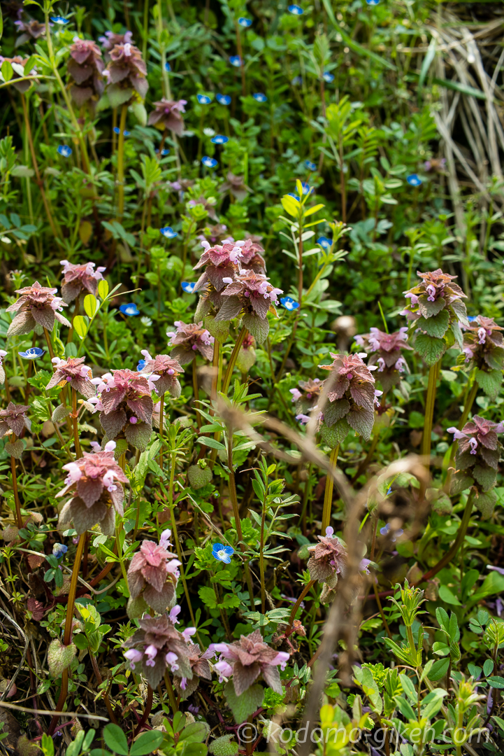 ヒメオドリコソウは春先によく見られます。オオイヌノフグリの開花とも重なるので、ここでは一緒に咲いていました。