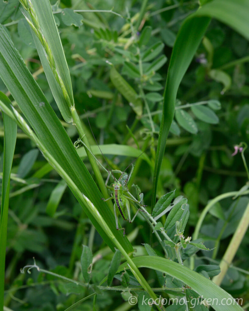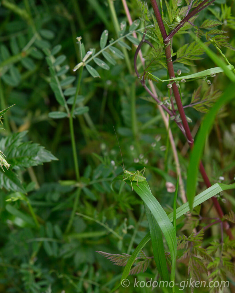 「笛にはもうちょっと大きくないとなあ」と思いながら見ていると、小さなバッタを発見。さあどこにいるでしょう?