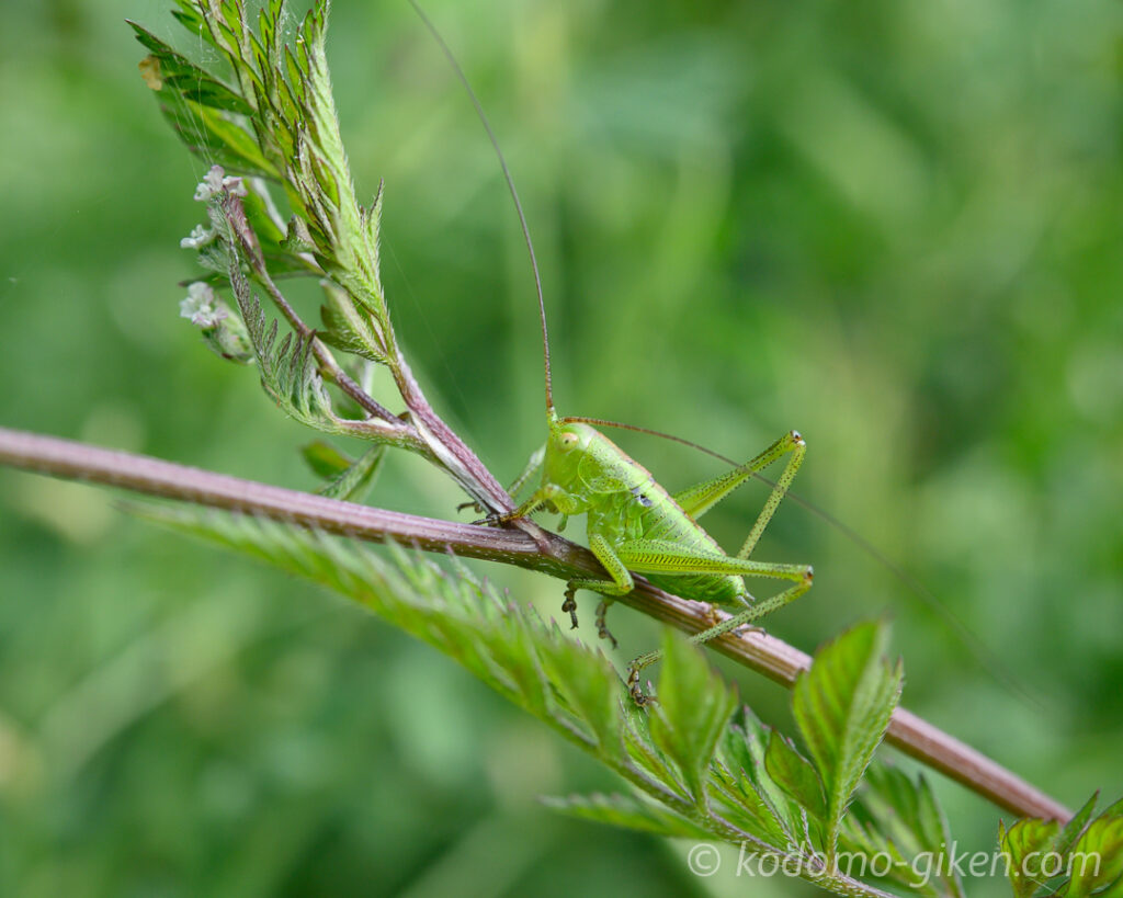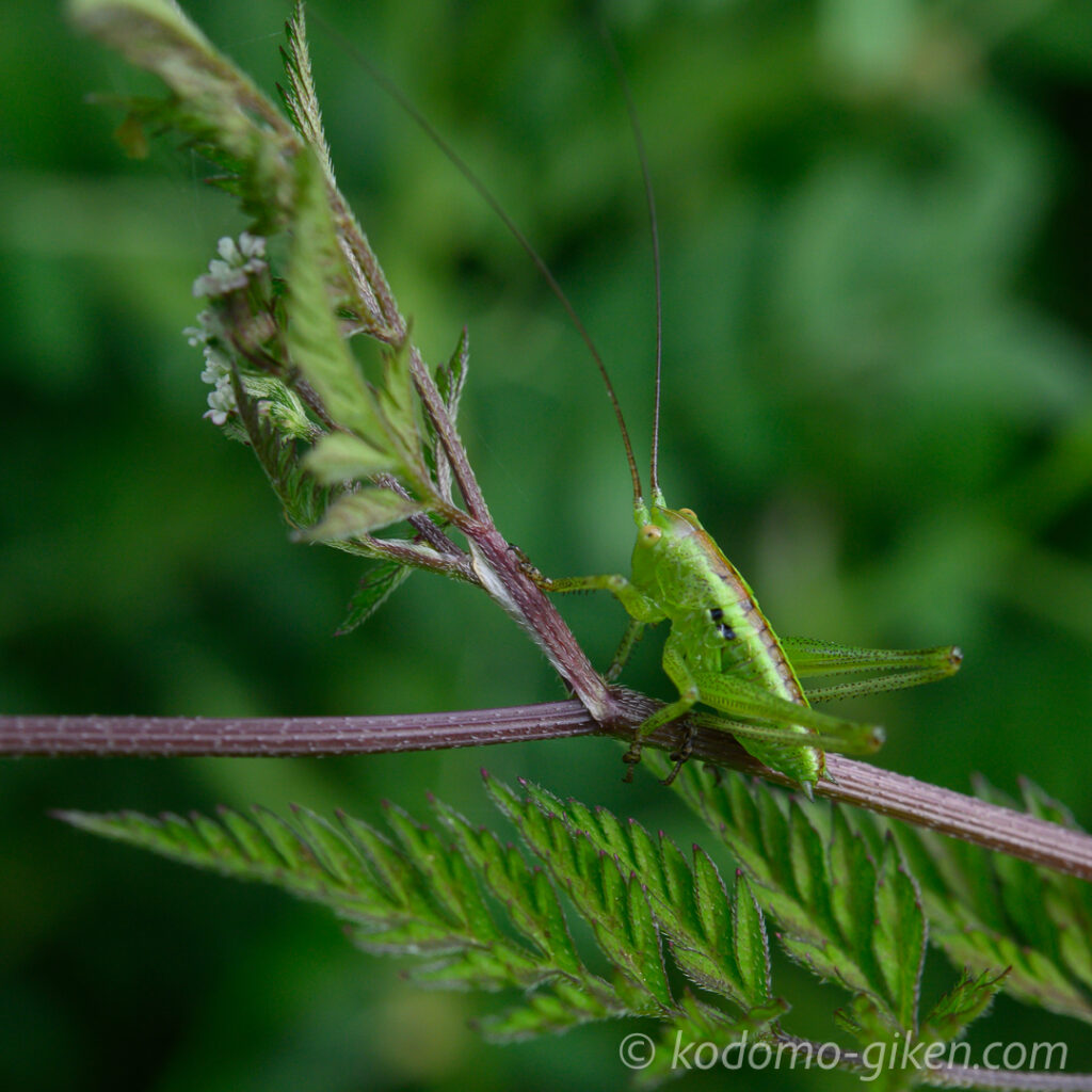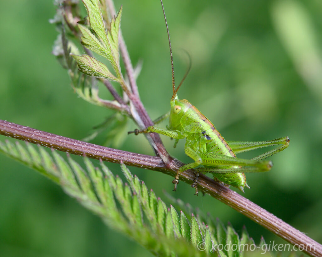 どこかに近くで撮らせてくれそうなヤブキリはいないかなとさがしていると、草の枝にとまっている、少し大きな幼虫を見つけました。