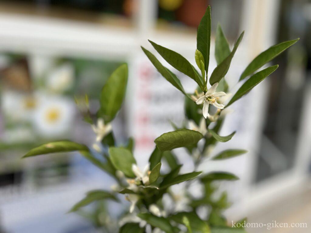 こども技研の入り口においている「みかんの木」に白い小さな花が咲きました。