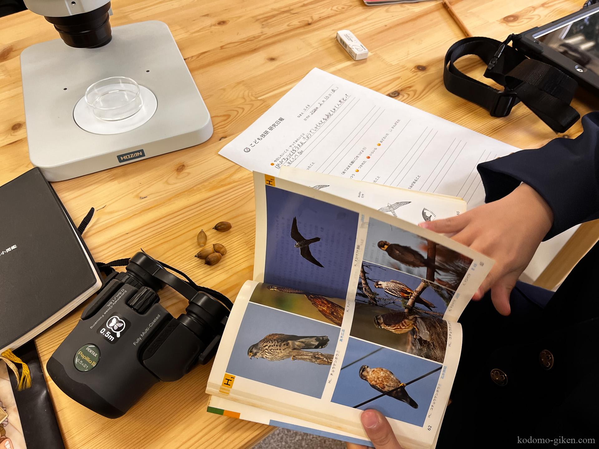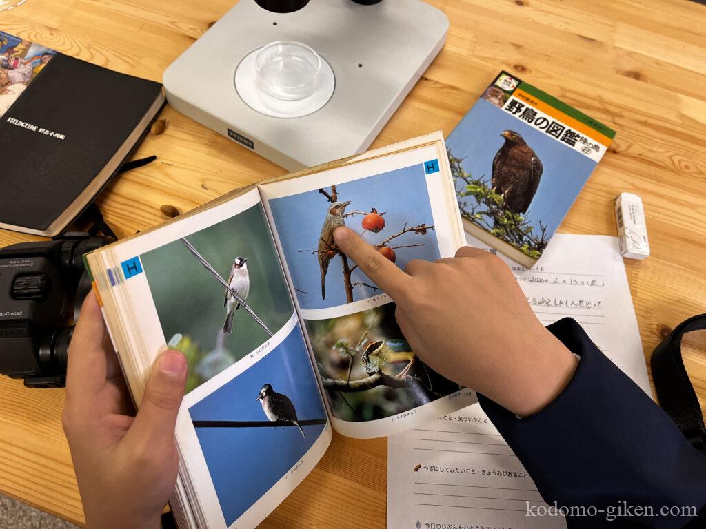 サイエンス教室で鳥を図鑑で調べている様子