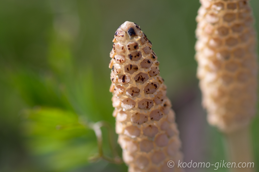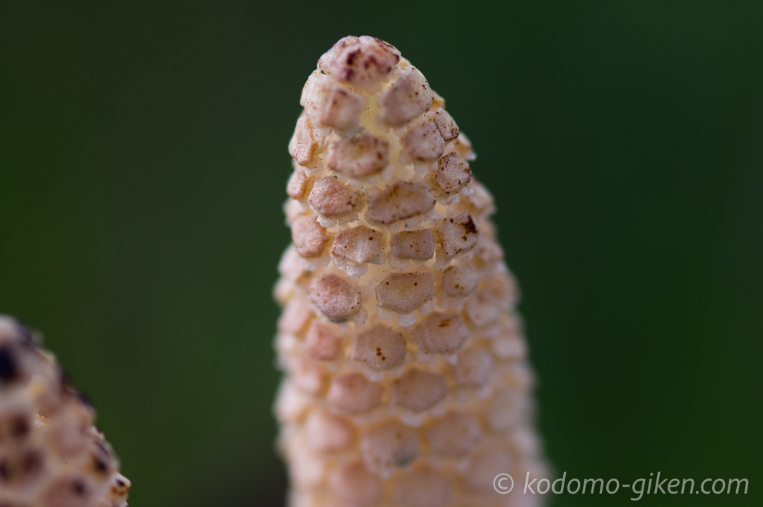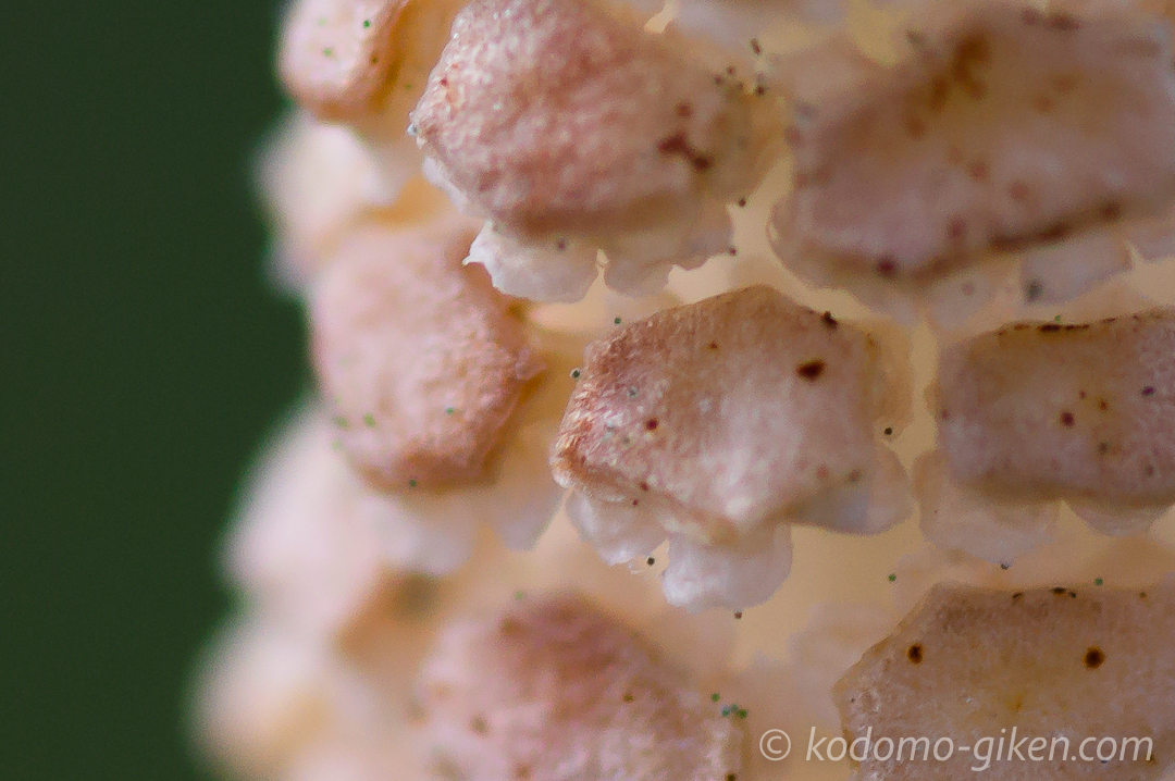 小さいみどりの点がちらほらあるのが見えますか?これがスギナの胞子です。顕微鏡で見ると緑の丸いのに手が生えているような形です。顕微鏡写真はまだ撮れないので、「スギナの胞子」で画像検索してみてください。